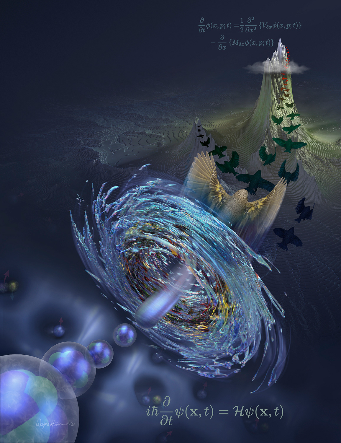 Physics principals behind influencing the movement of "cold atoms" by controlling their environment are evolving from strictly atom control into novel uses by evolutionary physicists to influence the "evolution" of the natural mutation seen in medicine, bio-pharmacology and agriculture. In this image blue cold atoms are controlled by optical lattices, represented by egg-crate like pits. Conversely, in evolutionary physics, the migratory charting of mutations are shown using fitness landscape charts that, instead of pits, create mountains or a mirror of what's seen with atoms. With an intentional nod to Darwin, the father of evolution, blue atoms are evolving into Darwin finches representing the "evolution" and introduction of cold atom concepts into the world of nature physics. Cold atoms tend to migrate to the bottom of lattices where as charting of mutations show patterns of migration towards the peaks with some making poor choices and getting lost and dying out along the way. Illustration was produced for use as the cover of a journal and subsequent collateral materials.