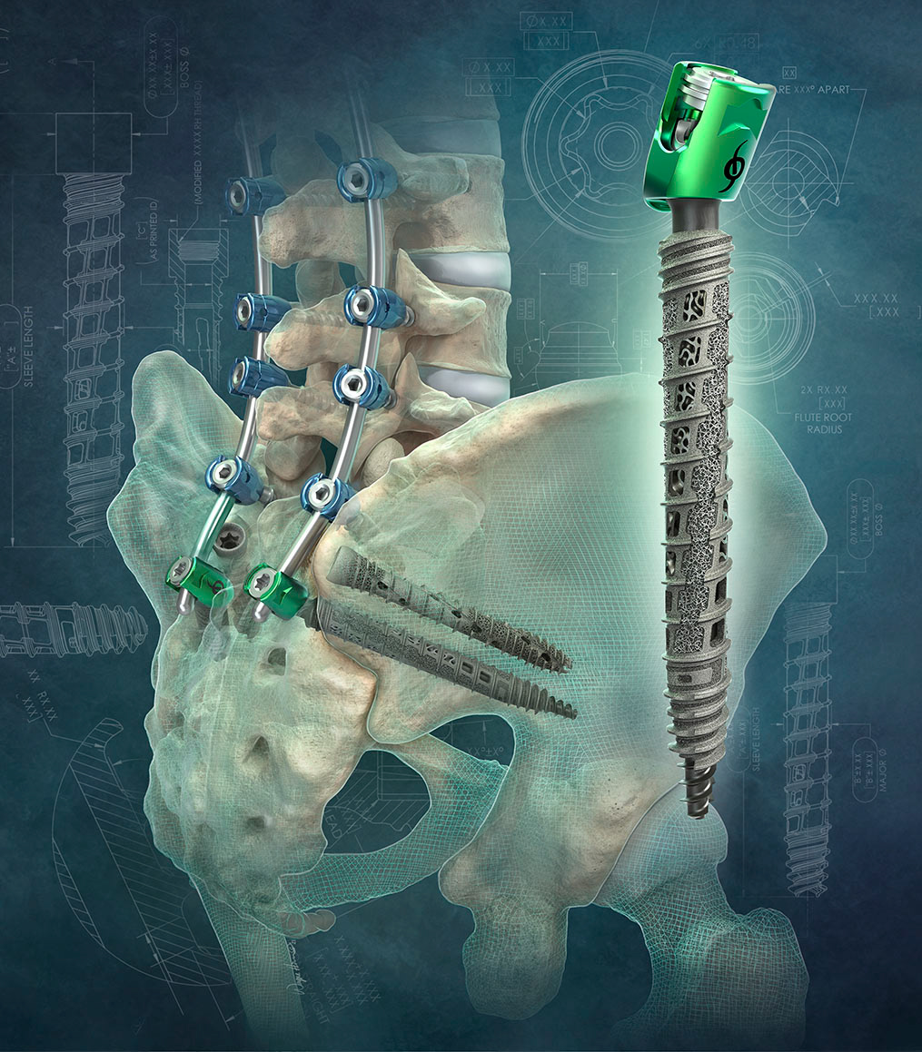 iFuse® Implant System for the SI Joint. This project received a 2022 Award of Excellence and the Ralf Sweet Memorial Members Choice Award from the Association of Medical Illustrators. This project included use of custom modeled 3D spine with integration of client CAD models to create a "coming alive" high tech look to represent the series.